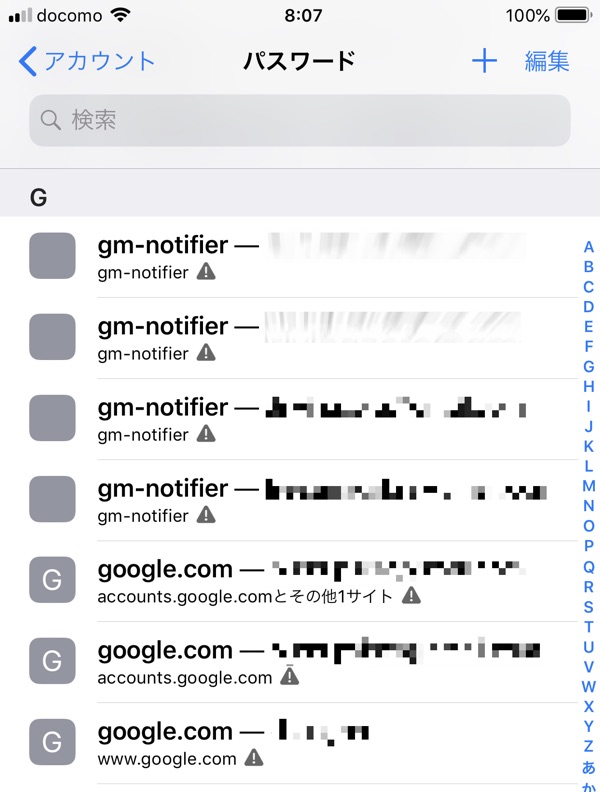 パスワードはURLごとに管理されるので、Googleなど同じサービスのIDを複数のサイトで入力する必要がある場合にも感嘆符が付いた灰色の三角が表示されます。