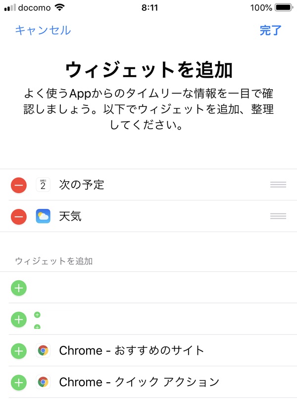 画面の下部までスクロールして、「編集」を選択するとウィジェットの設定画面に移行するので、必要ないウィジェットを削除します。