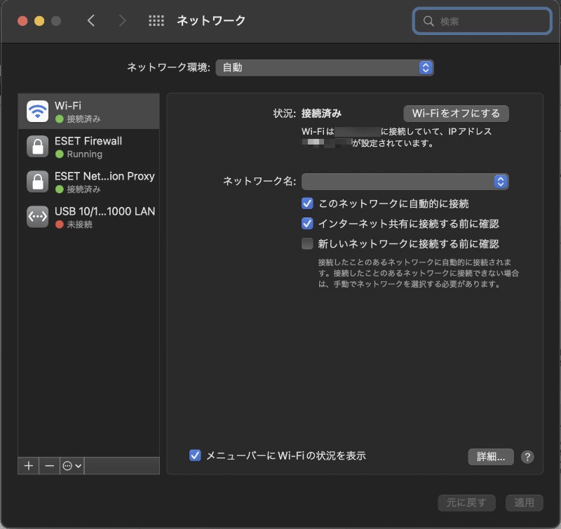 ちなみに、MacOSでは、SSIDが非公開のアクセスポイントに接続していると「Wi-Fiに関する勧告」というダイアログが表示されるようになっていました。