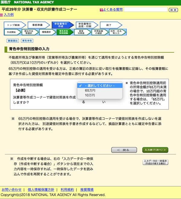 次の画面では「青色申告特別控除額」を選択します。