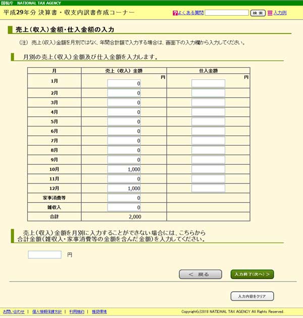 「売上(収入)金額 (雑収入を含む)」をクリックすると入力画面に移動します。