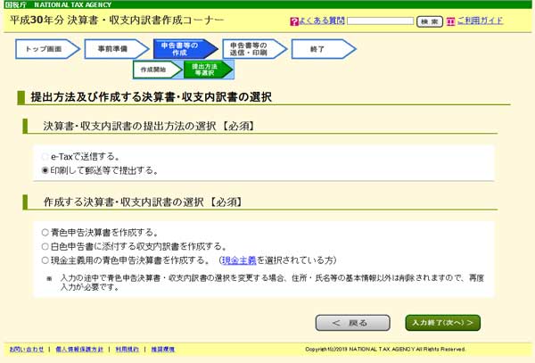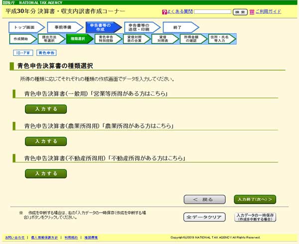 バックアップが終わったら「入力終了(次へ)」をクリックして「青色決算書の種類選択」に戻ります。