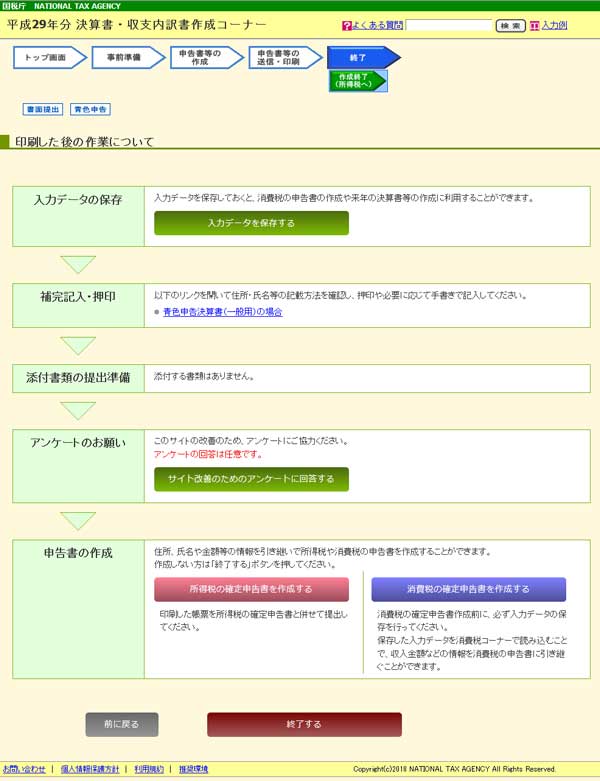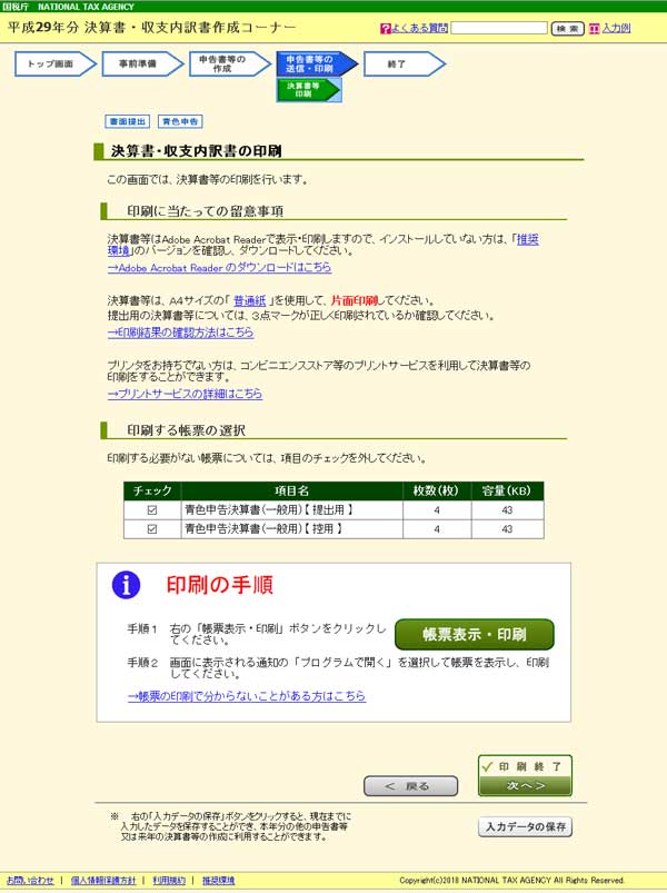 入力が終わったら「申告書等作成終了(次へ)」をクリックして、「決算書・収支内訳書の印刷」で書類をプリントアウトします。
