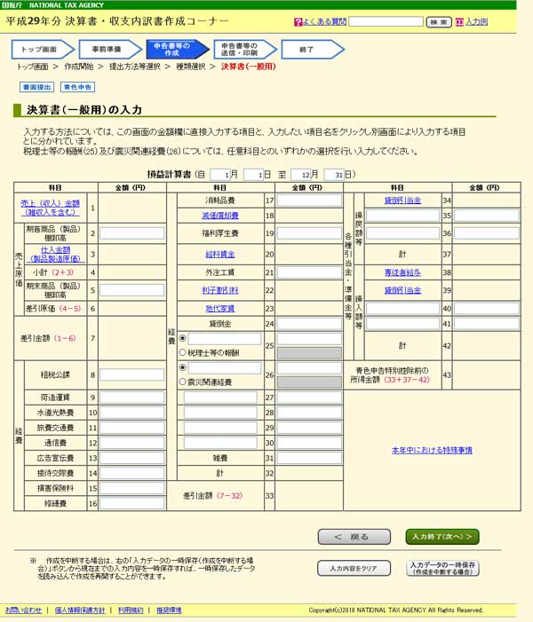 全ての必要項目に入力が完了したら、一度「入力データの一時保存 (作業を中断する場合)」をクリックして、入力データをバックアップしておきましょう。