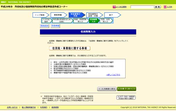 「所得・所得控除等入力」画面で必要な項目の入力が完了したら「入力終了(次へ)」をクリックして「住民税等入力」へ進みます。