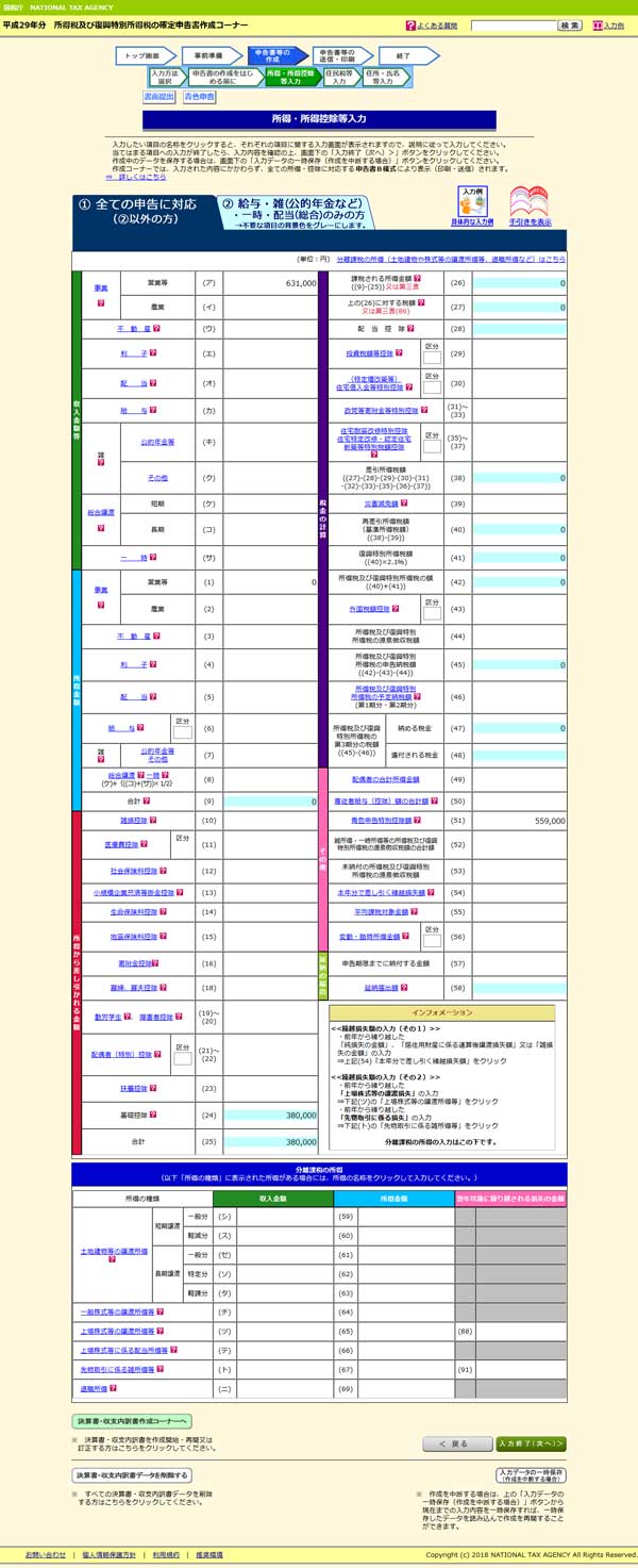 入力が終わったら、「入力終了 (次へ)」をクリックして「所得・所得控除等入力」に戻ります。