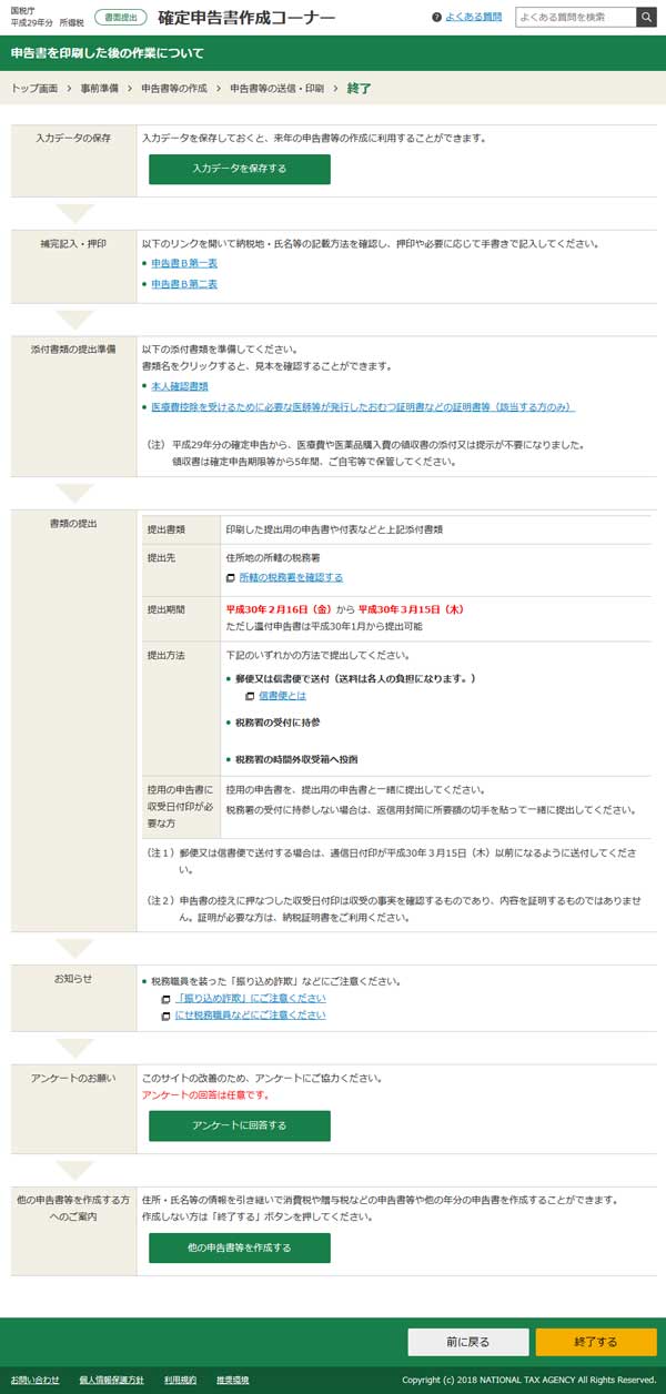 印刷が完了したら、「印刷終了 (次へ)」をクリックして、「申告書を印刷した後の手順について」へ進みます。