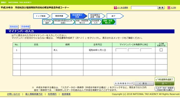 確認したら「次へ」をクリックして「マイナンバーの入力」進みます。