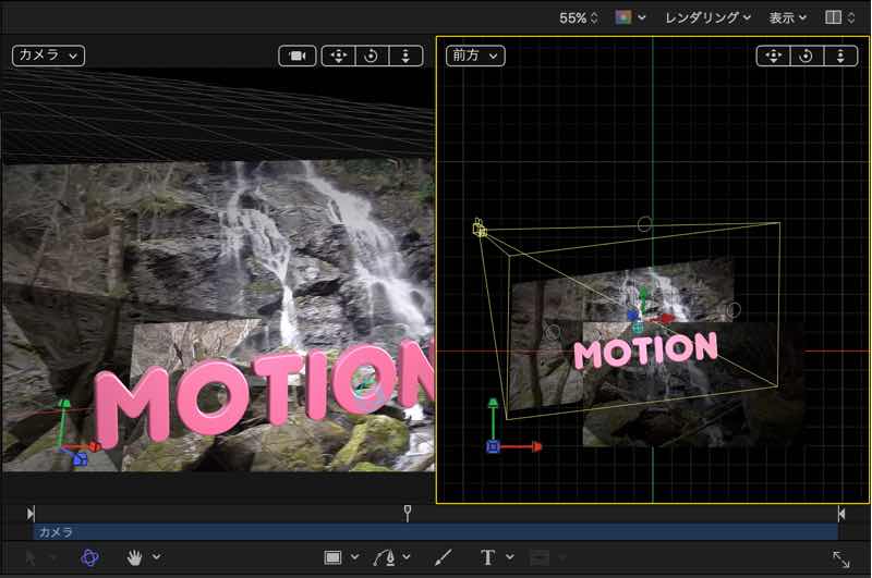 3D空間から見た映像でカメラの位置や角度を調整して、カメラからの映像を作成します。