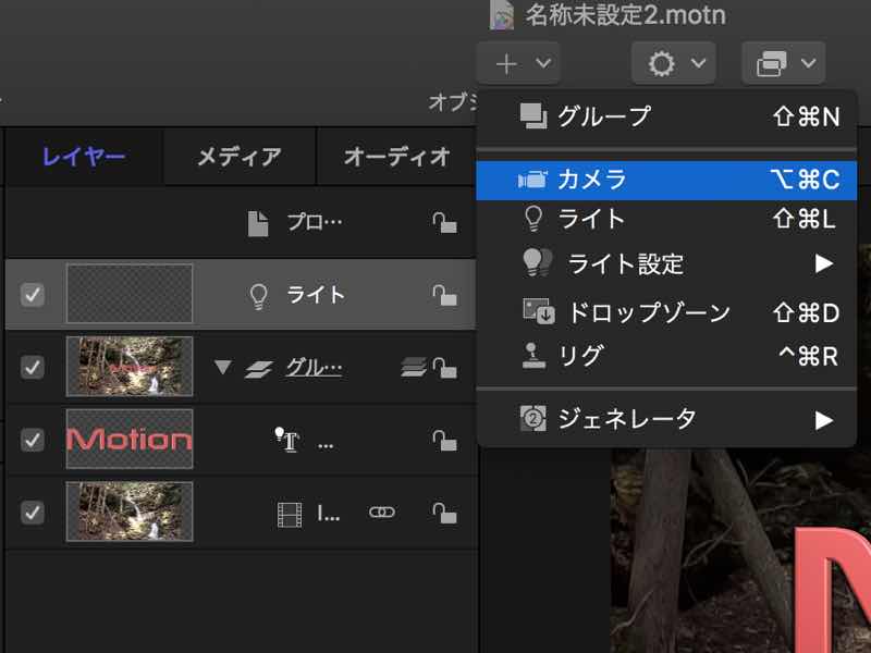 オブジェクトを追加から「カメラ」を選択してカメラを追加します。