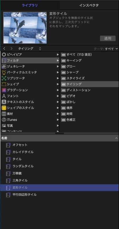 Motionには、「キーイング」・「グロー」・「シャープ」などたくさんのフィルターが搭載されています。 フィルターは、ライブラリ内のフィルターを選択して、「適用」ボタンを押して適用します。