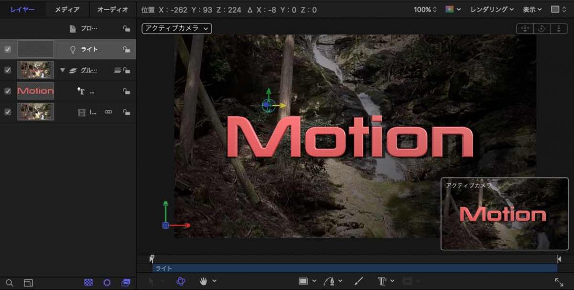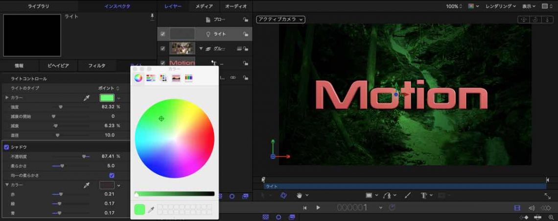レイヤーリストの「ライト」を選択して、インスペクタで「ライト」タブからライトの種類や強度などを操作します。