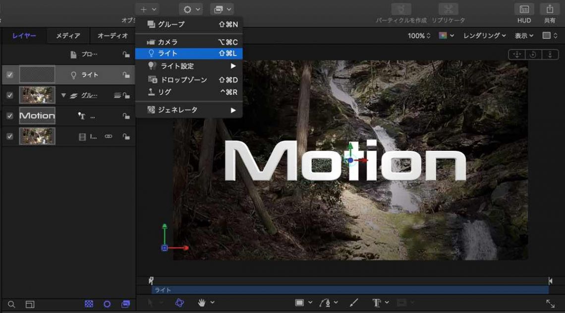 ツールバーの「オブジェクトを追加」から「ライト」を選択し、レイヤーリストにライトを追加します。