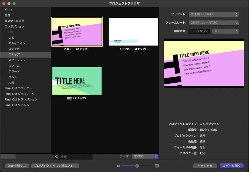 テンプレートは、コンポジションという項目でプロジェクトブラウザから選択できます。 右メニューの“コンポジション”の中から各項目に3つずつ保存されているので、選択して“コピーを開く”ボタンを押します。