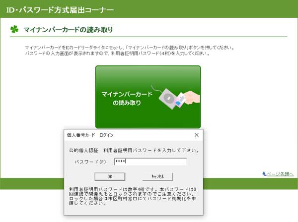 「マイナンバーカードの読み取り」をクリックして、4桁の個人番号カードの利用者証明暗証番号を入力します。6桁以上の署名用暗証番号ではありません。
