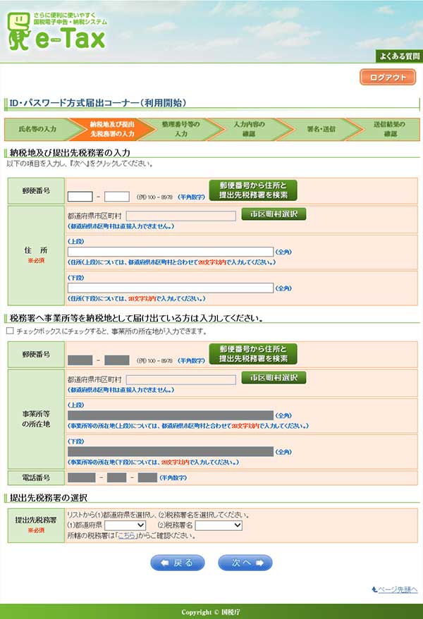 住所と確定申告書の提出先税務署を入力して「次へ」をクリックします。