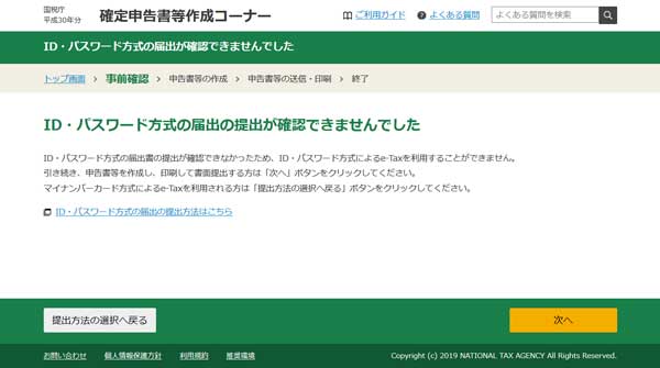 従来 e-Tax を利用していた人でも「ID・パスワード方式の届出完了通知」を受け取っていない場合は下記のような表示が出て、「ID・パスワード方式の届出」を利用することはできません。