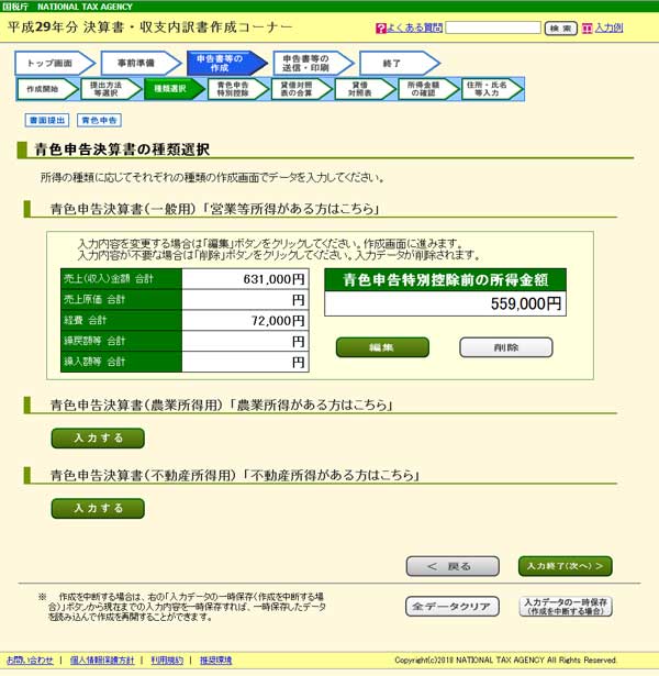 バックアップが終わったら「入力終了(次へ)」をクリックして「青色決算書の種類選択」に戻ります。