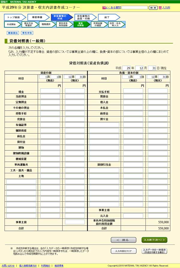 別途「貸借対照表」を作成していなければ、作成するを選択して「入力終了(次へ)」をクリックして進みます。