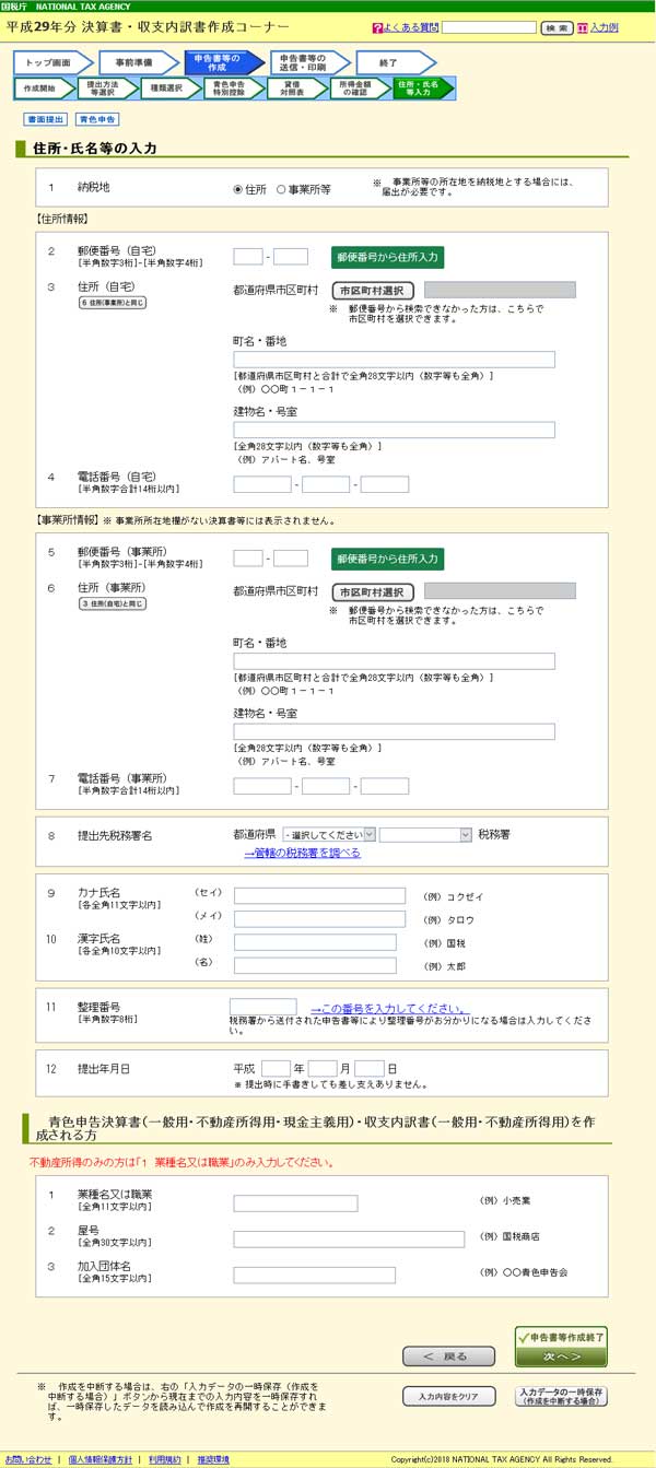所得額を確認して次へ進むと、申告書に記載する「住所・氏名等の入力」に進みます。