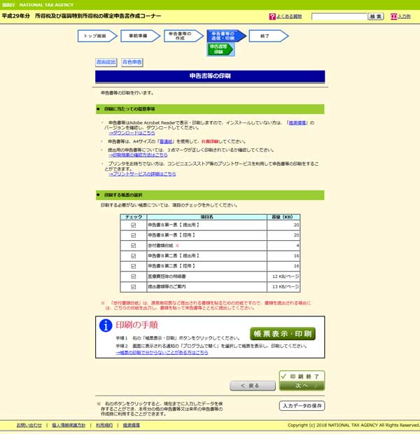 「帳票の表示・印刷」をクリックして、確定申告書をプリントします。
