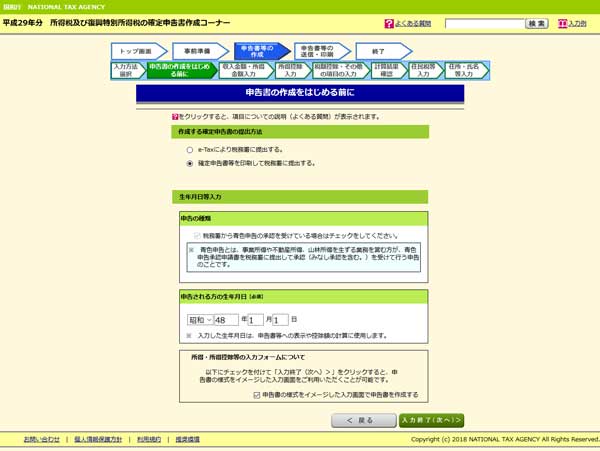 一番下の「申告書をイメージした入力画面で申告書を作成する」にチェックすると、申告書を埋めていく感じで作業できます。