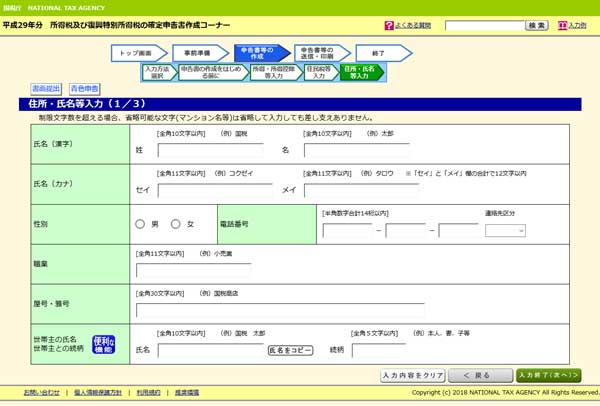 ここでは、確定申告書に記載する住所や氏名を入力します。