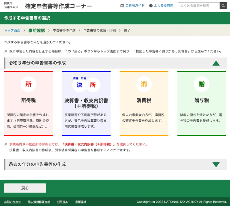 この画面から所得税の確定申告書を作成開始してみましょう。