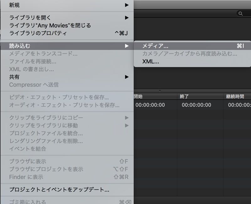 動画素材の読み込みは、メニューの『読み込み』からメディアを選択します。