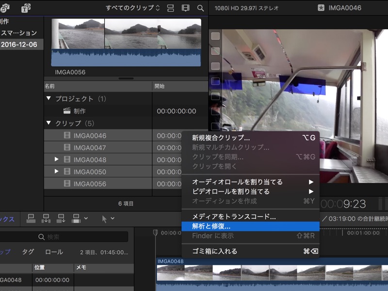 イベントブラウザで、解析するファイルを選択後、右クリックしてコンテキストメニューから「解析と修復」を選択します。
