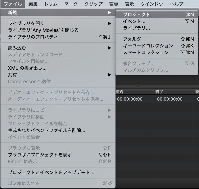 メニューバーの“ファイル”から“新規”を選択し、プロジェクトをクリックします。 commandキーと“N”を同時に押すと、作成ダイアログが表示されます。