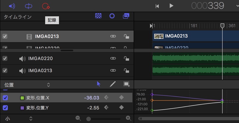 タイムライン左上の「記録」アイコンをクリックすると、時間経過に対するアニメートを直観的に操作して記録することができます。